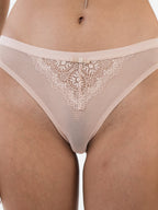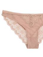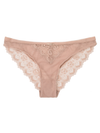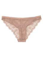 A romantic lace and semi sheer mesh bikini bottom, made with a comfy elastic waist and flattering ruching at the bum. Finished with a center front bow.